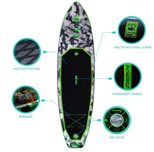 De opblaasbare en opvouwbare Funwater Camo SUP boards zijn geschikt voor recreatieve tochtjes,yoga of suppen met je hond. De Sup is ideaal voor de beginnende SUP’er. Zeer stabiel board.